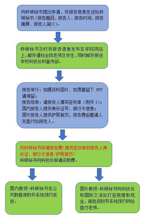 注:(蓝底框描述的是需要申请老师处理的,绿色底框描述的是需要科研秘书处理的)