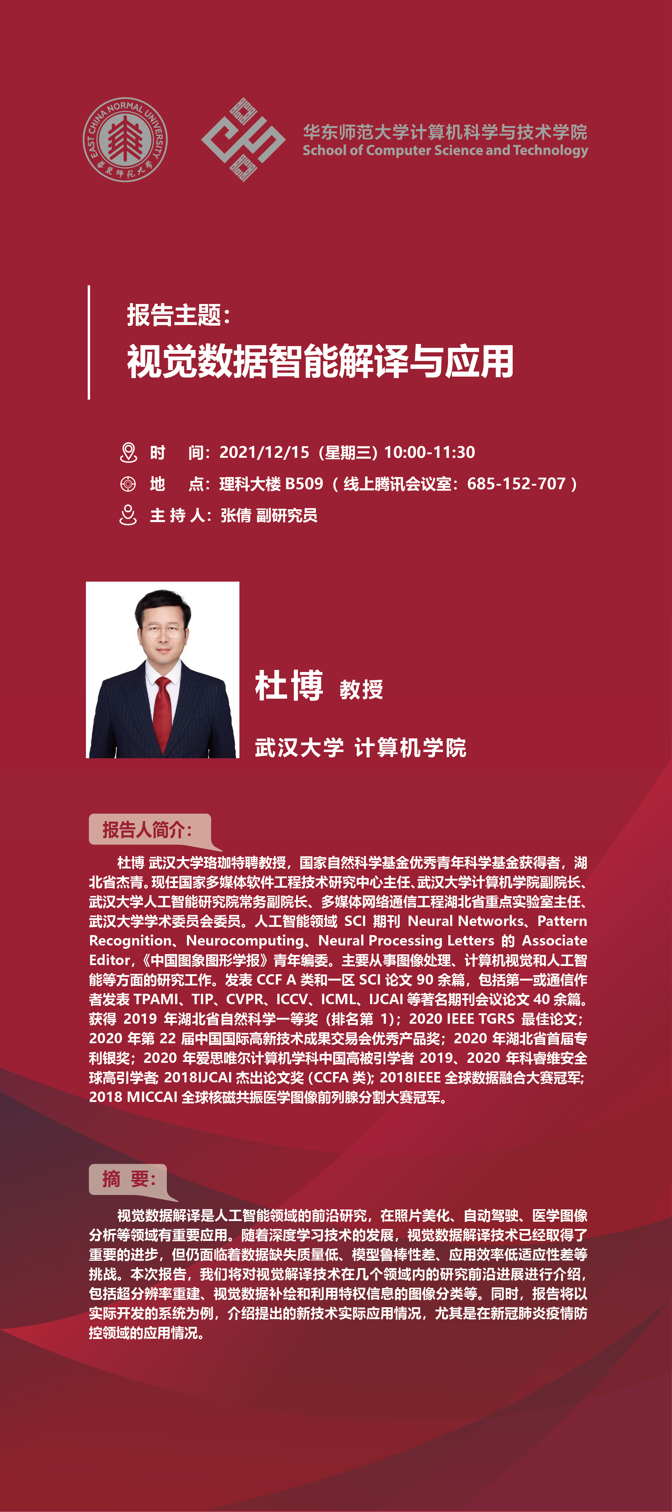 杜博,武汉大学珞珈特聘教授,国家自然科学基金优秀青年科学基金获得者,湖北省杰青。现任国家多媒体软件工程技术研究中心主任、武汉大学av影片 副院长、武汉大学人工智能研究院常务副院长、多媒体网络通信工程湖北省重点实验室主任、武汉大学学术委员会委员。人工智能领域SCI期刊Neural Networks、Pattern Recognition、Neurocomputing、Neural Processing Letters的Associate Editor,《中国图象图形学报》青年编委。主要从事图像处理、计算机视觉和人工智能等方面的研究工作。发表CCF A类和一区SCI论文90余篇,包括第一或通信作者发表TPAMI、TIP、CVPR、ICCV、ICML、IJCAI等著名期刊会议论文40余篇。获得2019年湖北省自然科学一等奖(排名第1);2020 IEEE TGRS最佳论文;2020年第22届中国国际高新技术成果交易会优秀产品奖;2020年湖北省首届专利银奖;2020年爱思唯尔计算机学科中国高被引学者2019、2020年科睿维安全球高引学者;2018IJCAI杰出论文奖(CCFA类);2018IEEE全球数据融合大赛冠军;2018 MICCAI全球核磁共振医学图像前列腺分割大赛冠军。