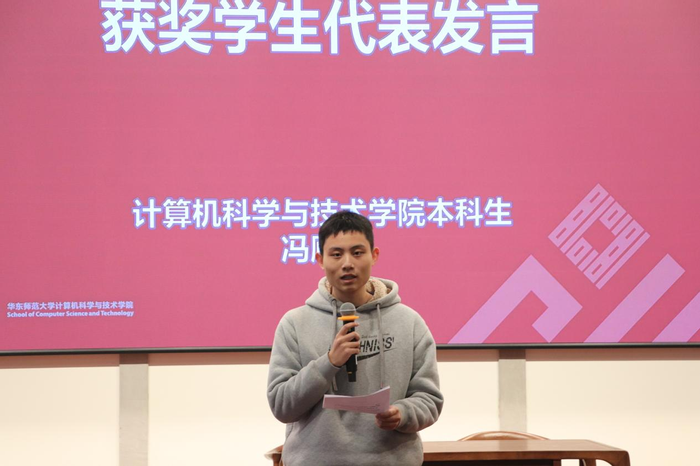 随后,宽睿科技董事长兼CEO刘鑫博士和教育发展基金会副秘书长张赫共同为“拔尖奖”获奖学生颁奖。研究生卢俊鑫在领奖后,回顾了自己在华师大求学的历程,总结了自己在博士阶段的收获与感悟,感谢奖项的设立方和学院,并表达了自己坚持科技创新道路的决心和信念。