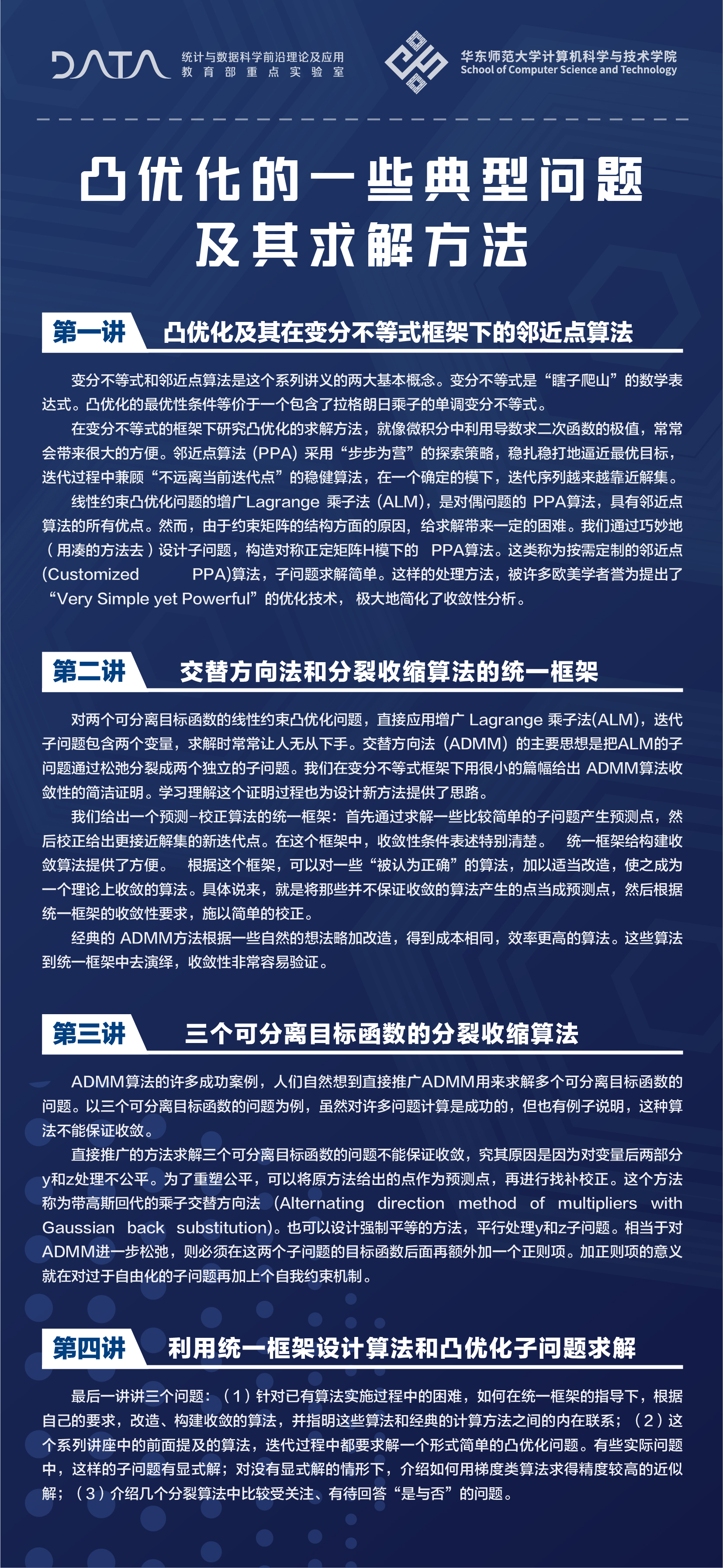 最优化方法在广泛的应用科学领域起着日益重要的作用。这四单元的系列讲座介绍信息科学中一些基本的凸优化问题及其实用的求解方法。首先,我们介绍凸优化的一些基本理论,变分不等式(VI)和邻近点算法(PPA)是求解凸优化问题的两大法宝。听起来复杂的变分不等式,实际上就是“瞎子爬山”判别“是否到达了顶点”的数学表达形式;邻近点算法是步步为营稳扎稳打的求解方法。我们用变分不等式和邻近点算法建立起来的统一框架,介绍凸优化的分裂收缩算法,其中包括原始-对偶的CP方法,按需定制的邻近点算法,两个可分离复合优化的乘子交替方向法(ADMM),多个可离复合优化的凸优化问题修正的ADMM类方法。统一框架不但使算法的收敛性证明变得异常简单,也给根据问题要求构造新算法提供了手段。课程最后指出有望提高凸规划分裂收缩算法效率的一些可能途径,也提出一些我们希望继续探讨的问题。听众所需的预备知识只是:线性代数的基本运算和微积分最一般的基础知识。