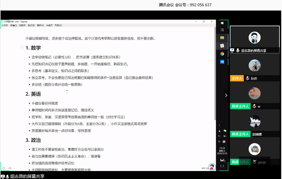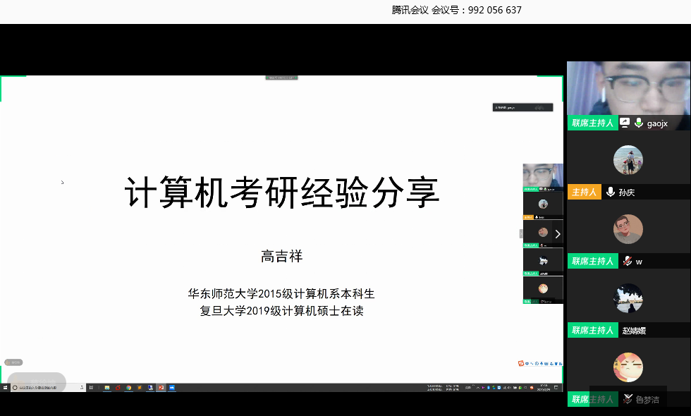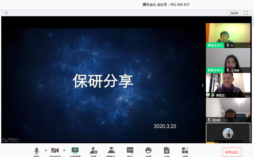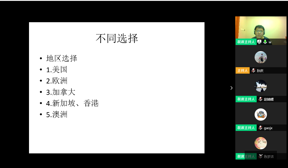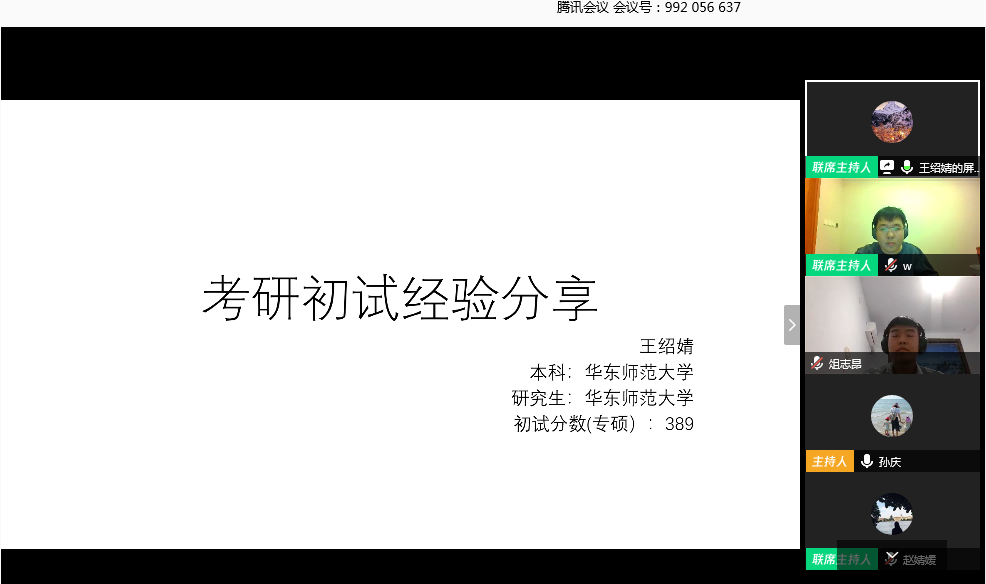 3月25日晚上7点,av影片 出国(境)、升学经验交流分享会顺利举办,学院100多位学生积极参与其中。本次活动特别邀请了av影片 15级本科毕业生曹智杰、温伟浩、高吉祥,19级研究生俎志昂、王绍婧,和同学们线上分享考研、保研及出国留学经验,分享会由辅导员孙庆主持。