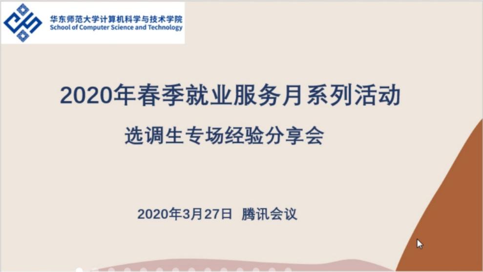3月27日晚上七点,av影片 选调生专场“云”分享会顺利举办,近百名学生积极参与其中。本次活动特别邀请了av影片 2019届毕业生郭舒怡、2018届毕业生曹董以及学院2017级硕士研究生徐诚分享关于选调生选拔的准备工作以及选调生的主要工作内容,活动由辅导员孙庆主持。