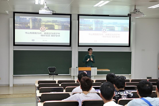 学院优秀毕业生党员、原博士党支部书记吴兴蛟以“书山有路勤为径,俯首甘为孺子牛-做好党员,做好学术”为主题,告诫同学们要树立积极的学术观念,正确合理表达自己的意愿,积极奉献,回报社会,时刻以一个党员标准要求自己,发挥先锋引领作用。其间,通过自己科研的经验与社会经历,他也对同学们提出殷切的希冀:希望同学们“博闻之,审问之,慎思之,明辨之,笃行之”,从生活中学习,在学术中锤炼,做到真正的“风声雨声读书声声声入耳,家事国事天下事事事关心”,努力成为全面发展的综合型人才。