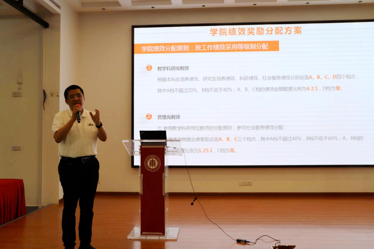 党委书记王长波、副院长贺樑介绍了2021年av影片 绩效奖励分配方案实施细则,副院长(主持工作)周爱民介绍了学院自筹绩效分配方案实施细则。细则制定过程中学院充分听取教师意见,并经与会教师现场投票,获高票通过。