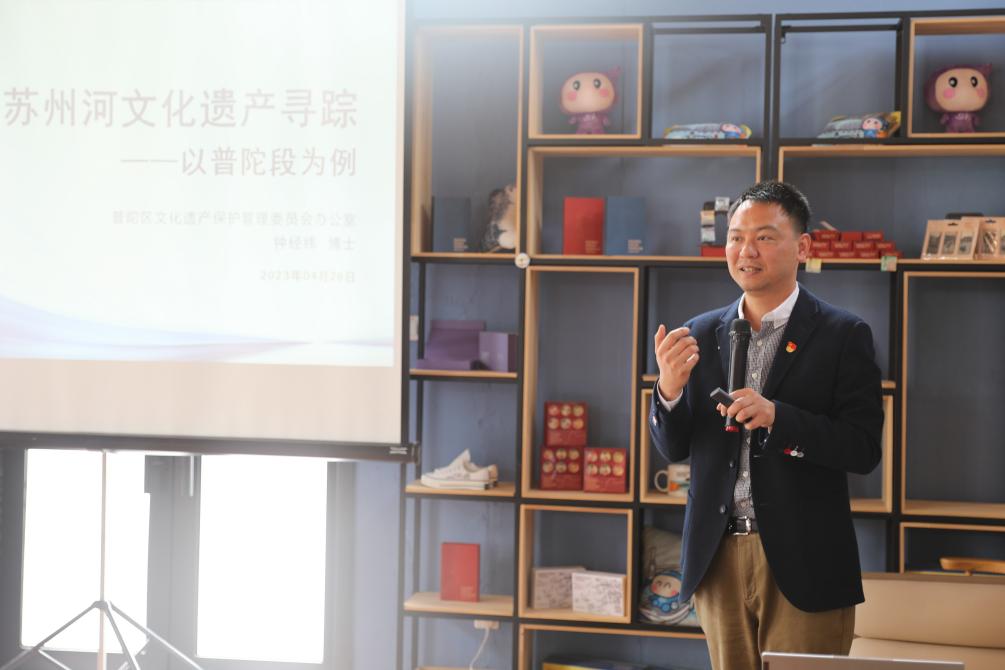 活动特邀普陀区文化馆党总支书记、馆长钟经纬为大家作“苏州河文化遗产寻踪——以普陀段为例”的专题讲座。党员们在“半马苏河”中景色最美、生态最优地段的长风湾驿站,沉浸式聆听苏河发展历史,更深切的感受普陀高质量发展的“实景图”。