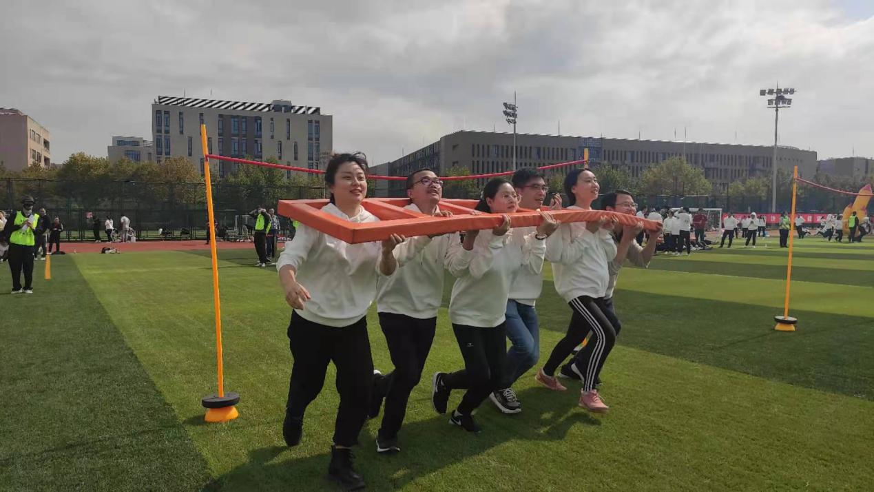 杨文彧、李晨辉、张宏菊、钱鸿、赵婧媛、曹强6位老师参加的“协力云梯”项目也获得了三等奖。他们团结协作,动作整齐划一,扛着云梯顺利完成仰卧起坐等各项关卡。