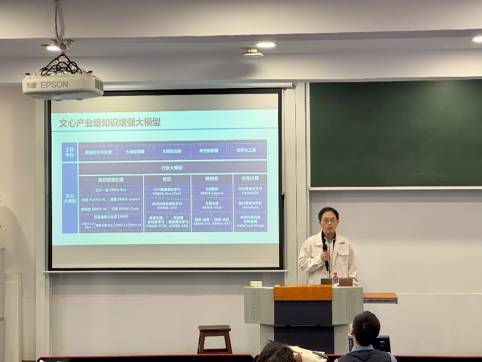 11月6日下午14点,百度资深工程师方华强受邀在计算机楼B115,带来《文心加飞桨技术创新与产业应用》主题报告。报告由周杰青年研究员主持。方化强老师系统介绍了百度大模型的主要架构、发展路线、算法优化以及应用平台等多个方面,其研发思维链、训练加速、推理加速、知识增强等核心算法,集成于Paddle平台,为国内大模型生态做出了重要贡献。他通过具体实例,展示了文心大模型在文本生成、代码生成、数学解题和图像生成等场景的使用方式和效果,让研究生对大模型能有更加深入的了解,促进学生更好地利用AI技术来解决学习和生活中的问题。